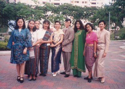 | The following picture was taken at the 1st Asian Inter-Varsity Debates in December 1994, which saw participation from Universities all over Asia. This pic was taken just before our first formal dinner: dress code was National Dress, and that's why we had all the lady debaters dressed up in their National best. I was close to the teams from Thailand on this occasion, and this picture perhaps best shows the diversity of their cultural, particularly in their dresses. The original intention was that the Thai team wanted to take the picture with me, but Prof. Piya roped in the entire contingent of Asian debaters- and before I discovered what I'd got into, I was surrounded! |