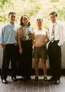 | Note: they *asked* for this photo to be taken with me- I really really really had nothing to do with it! None of the Singaporean debaters on that occasion wore the batik shirt, so we wore suits instead. That's Asst. Professor Piyanart Faktorngpan on the rightmost, my very good friend, and also coach for the Prince Chulalongkorn University. Next: the below is a more recent picture, taken during the 4th Asian University Debates, in July 1997. That's me with the speakers from the University of Philippines, the eventual runner ups to the whole tournament. Diane Desierto (whose guest entry you can find in my logbook) is the second person from the left of the picture. The tournament was hosted in Singapore, and was the second international tournament that I was adjudicated in. |