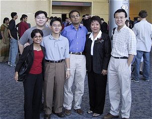 | And finally, some of us from the 1994-1995 NTU Alumni Debaters. Since all of us are now working (obviously!), not all of us could actively adjudicate in this tournament though- only Chitra, myself and Kwee Bin could (though KweeBs was conspicuously missing from this picture). From left to right; Chitra, Teh Seng Leong (President of the NTU Debating Society 94-95), Sanford Chee (of the Worlds Princeton series), Ajit Mohan (Worlds 96, Asians 97), Mrs. Khong (our mentor, coach, and common focal point for all of us), and myself. |