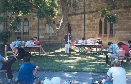 | Picture below: one of the World Masters debates in progress in open-air. Most in the audience were seated on the lawn, with at least a couple simply lying down on the grass too. Again, it's a little hard to do this sort of thing in Singapore, since any sort of body contact with the ground (apart from your feet!) will almost certainly result in a swarm of ants and whatever ground inhabitants there are invading your person. But seriously, as you can see in this picture, there are four teams on two sides in a debate in the Worlds series. It's modeled after the British Parliamentary style of debating, with an Opening, and Closing Government teams (comprised of two persons a team), and the Opening and Closing Opposition speakers seated on the right hand side. There are three adjudicators seated on the far right- adjudication panels are always odd in number in order to facilitate voting when necessary. The person speaking right now is the 1st member of the Opening opposition. The motion for this debate? "That we should club baby seals." :) |