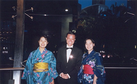 | That's me with two Japanese friends, all dressed up in their national refinery. I think out of the entire Asian contingents, the Japanese comprised some of the best sports in the tournament, taking part in the World Masters and also coming for formal occasions like these in their best. Not like us Singaporeans, who all uniformly came in suits or worse :) I never got the name of the friend on my right, but on my left is Kumiko Tsuboi from the Tokyo Women's Christian University. She's a third year student in Japanese culture, and quite forthright in thinking, a great departure from the more traditionalist thinking of women in Japan. We talked quite a bit during our stay in the tournament... :) Hmm... that's me blushing, not a result of that nine day tan I had! |