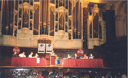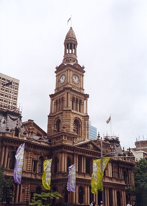 | Sydney Town Hall where we had our Grand finals on the 11th January. This auditorium is a frequent venue for a good number of cultural and classical performances by artistes in the city, and I thought was a greatly appropriate venue for the last debate of the Worlds 2000. The town hall is situated at the end of George Street, a long road that I must have walked at least a half-dozen times during my stay in Sydney. |