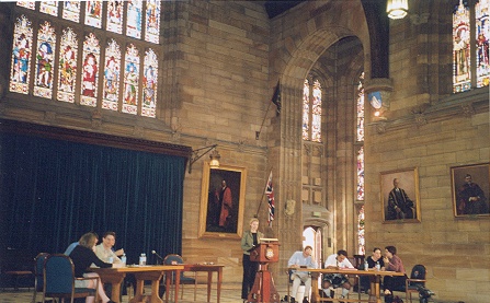| Another picture of a debate in progress. This was during our semi-finals on the 11th, and it was held inside the Great Hall of the main building where we also had our opening ceremony. Lunch-time concerts are regularly held in this hall. There's even a pipe-organ right on the other side of the hall too. The teams in this round were from Stanford University and Edinburgh University (could be wrong) in the Government (left) side, facing the Inner Temple and the eventual winners of the tournament, Monash University on the opposition side. |